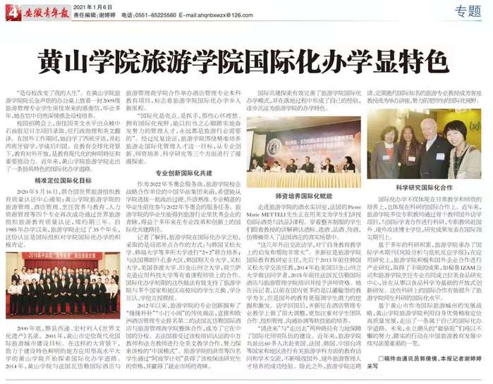 1月6日,《安徽青年报》以《黄山学院旅游学院国际化办学显特色》为题专版深度报道我校旅游学院在教育全球化背景下教育对外开放的国际化办学道路。