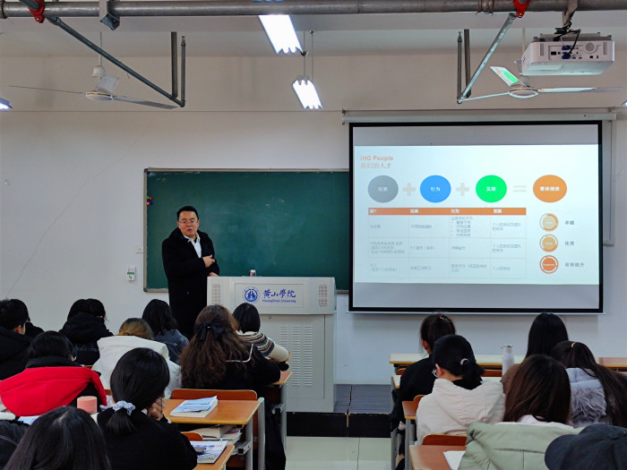 12月16日,旅游学院国际教育教研室邀请昱城皇冠假日酒店总经理裴涛先生为2020级全体酒店管理(中法)专业学生做专业启蒙教育讲座。