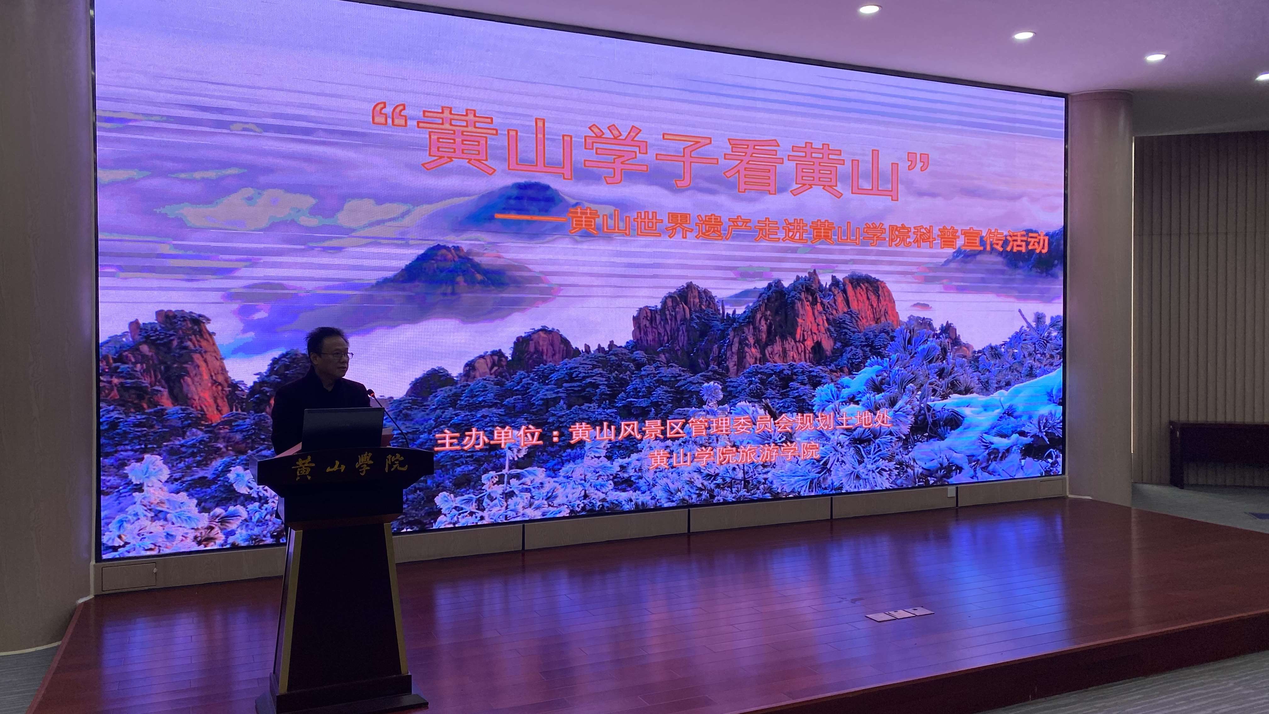 12月4上午,由黄山学院旅游学院和黄山风景区管委会规划土地处共同主办的“黄山学子看黄山”—黄山世界遗产走进黄山学院科普宣传活动在黄山学院率水校区文端楼第二报告厅举行。黄山风景区党工委委员、规划土地处处长刘一举,黄山风景区宣传部常务副部长程亚星,黄山学院党委委员、宣传部部长张赛,旅游学院党委书记陶卫平、院长金声琅、副院长孙克奎出席活动,活动双方代表及黄山学院师生近300人参加了本次活动。