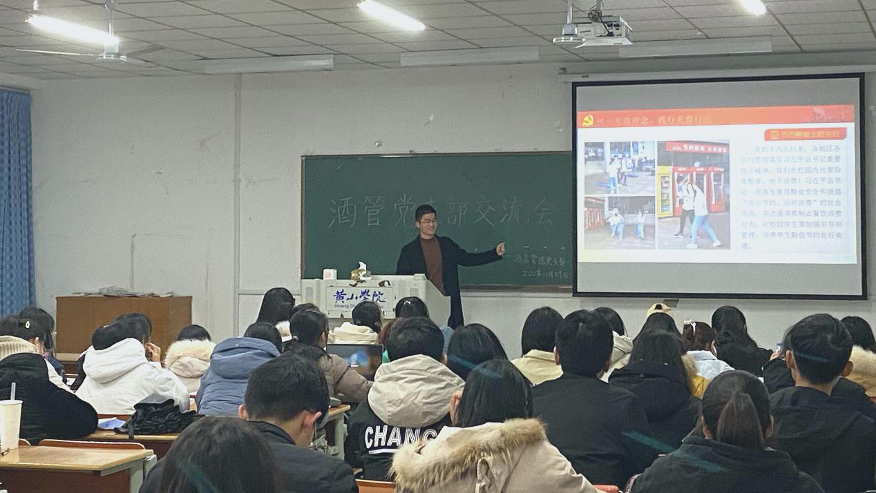 2020年11月29日,酒店管理党支部在逸夫综合楼5506教室开展“永远跟党走”专业知识经验分享会。18、19级所有预备党员及入党积极分子和20级全体新生参加了此次会议。本次交流会的目的是为了传承酒管党支部“传帮带”的优良传统,与学弟学妹们面对面交流,为他们答疑解惑,增强同学们对中国共产党的了解,引导他们不断的向党组织靠拢。