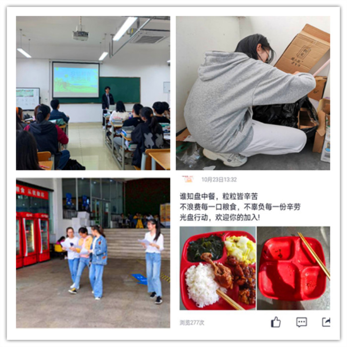 此次活动各班级团支部围绕“厉行节约·反对浪费”这一主题开展,以主题演讲、旧物回收、光盘行动、问卷宣传等各种方式,让同学们在活动的参与过程中深刻理解勤俭节约,艰苦奋斗的实际内涵,激励全体同学从身边小事做起,养成勤俭节约的好习惯,为建设节约型校园贡献力量。