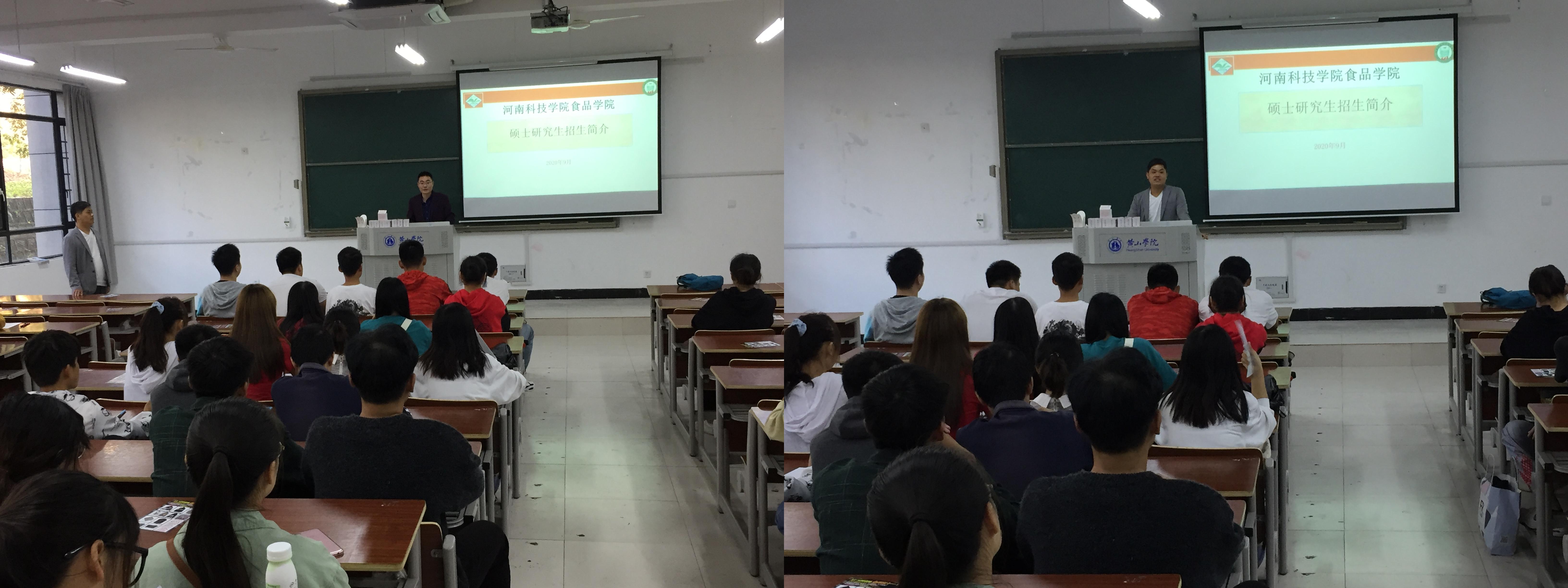 此行河南科技学院毕继材博士还对18级、19级烹饪与营养教育专业开展硕士研究生招生宣传工作,并受到了同学们的热烈欢迎,极大增强了我院烹饪专业同学对考研的兴趣,宣讲会由孙克奎主持。