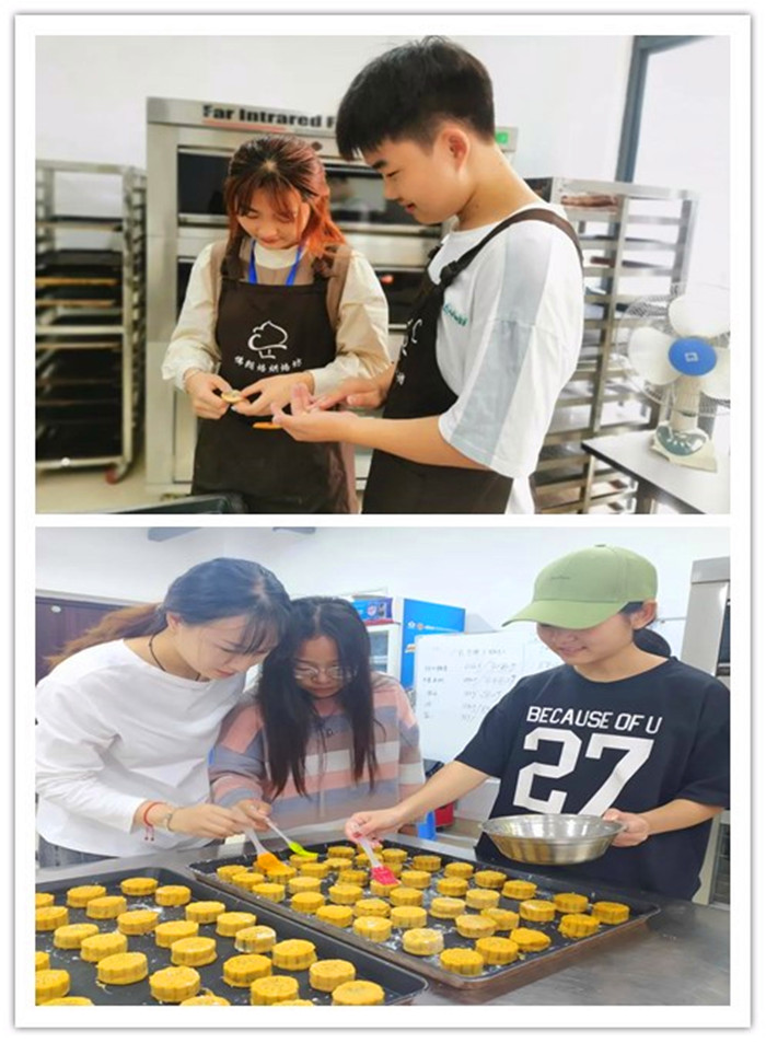 当天下午,该院学生会成员代表来到佛朗焙烘焙坊操作间,与烘焙坊成员们共同制作月饼。工作人员向同学们详细说明操作注意事项,带领大家做好卫生清洁工作。在和面、称重等制作过程中,同学们纷纷动手尝试,工作人员细心讲解、做示范,现场一片忙碌景象。经过一下午的紧张忙碌,月饼制作并包装完成。