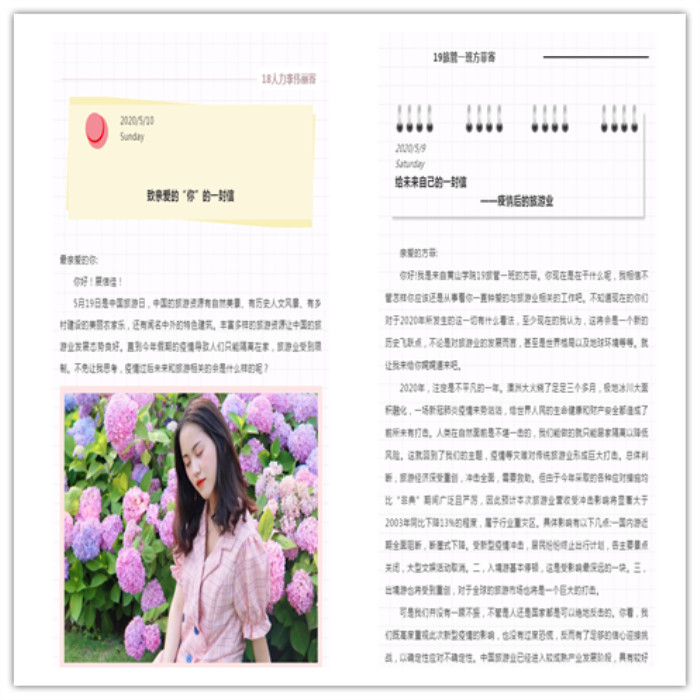 面对当前疫情对旅游业的冲击,各位参赛选手以书信的形式,围绕“面对疫情的冲击,旅游学子的信心”这一主题进行创作。今年的疫情,对旅游业的影响很大,同学们给未来的自己写一封信,通过表达名山脚下旅游娇子读万卷书,行万里路,推动全域旅游,全民安康的志气与抱负,鼓励未来的自己对今后继续从事旅游业,助力旅游业继续发展充满信心,就自己将如何学习好专业知识进行讲述,字里行间流露出对所学专业和中国旅游业的热爱。
