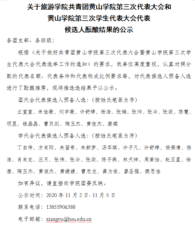 【公示】共青团黄山学院第三次代表大会代表和 黄山学院第三次学生代表大会代表旅游学院候选人酝酿结果的公示