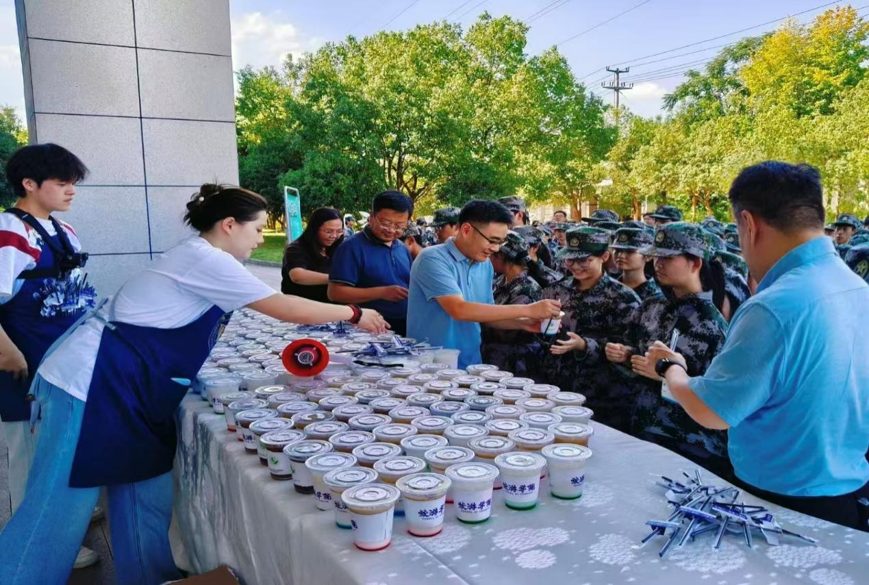 派发现场,志愿者队伍有序开展饮品分发工作,将一杯杯特色咖啡递到新生手中。同学们接过定制饮品后,不约而同举起印有“旅游学院”标识的咖啡杯记录这一温馨时刻。与此同时,学院领导与教师深入各连队之间,亲手将饮品交到学生手中,他们以亲切的笑容传递关怀,细致询问同学们的军训感受,鼓励大家克服困难、磨练意志,现场洋溢着欢快而温暖的气氛。