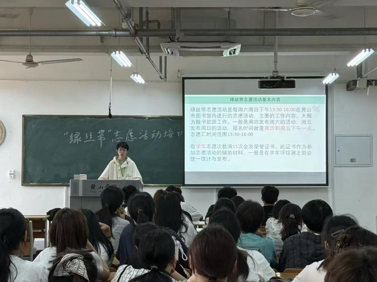 培训会筹备阶段,工作人员提前抵达场地,引导到场新生有序完成签到流程,并协助其按指定区域就座,确保培训活动高效开场。培训环节,主讲人聚焦绿丝带志愿者常规活动体系,系统阐述了绿丝带志愿活动服务过程中需遵循的基本准则。针对图书馆志愿活动这一重点常规项目,明确了图书整理、借阅引导、秩序维护等不同岗位的工作细则,同时对志愿组长的统筹协调职责、任务分配方法、突发情况上报流程等内容进行全面说明。此外,培训还着重强调志愿服务纪律规范,明确要求志愿者在服务期间需保持端庄仪态与文明礼貌,严格遵守图书馆管理制度,尊重工作人员的调度安排与读者的阅读需求,以严谨态度与良好风貌彰显旅游学院学子的综合素质。