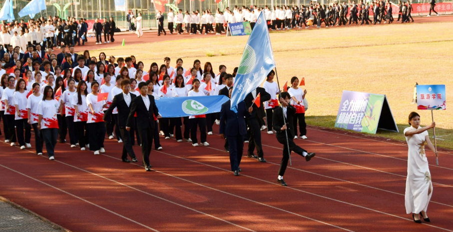 开幕式上,运动员进行曲奏响,旅游学院的方阵队员们迈着铿锵有力的步伐,以整齐划一的姿态稳步走过主席台。他们精神抖擞、口号嘹亮,充分展现了旅游学院学子的青春活力与昂扬风貌。