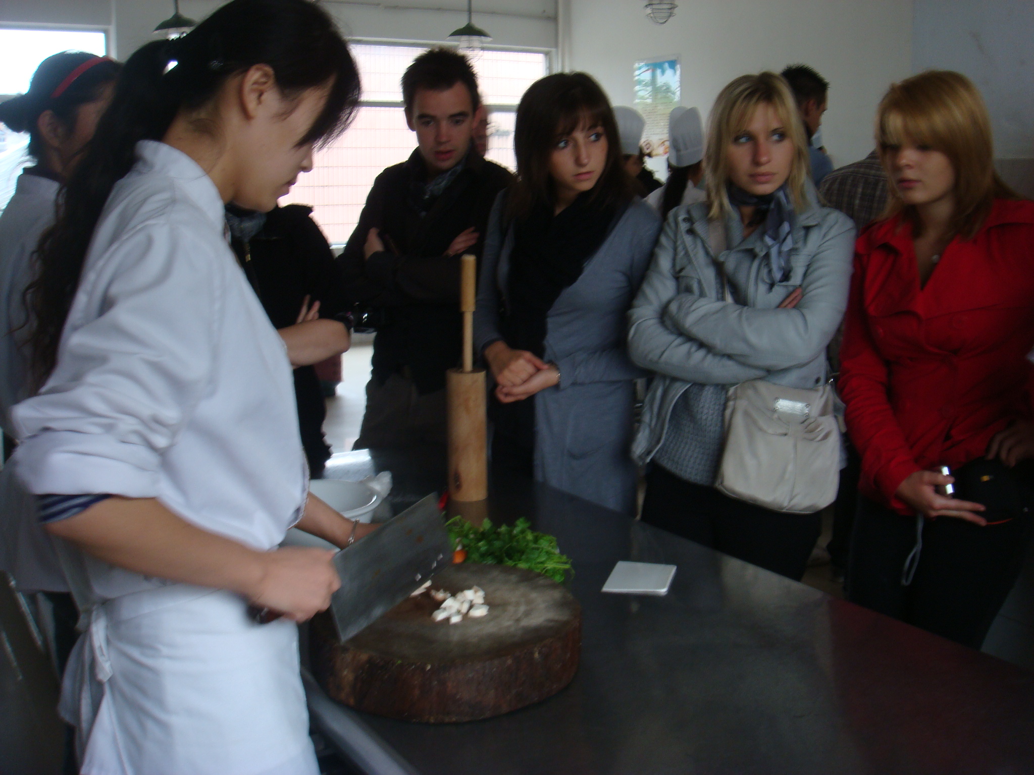 据悉,此次法国Friant高等技术学院共有20名学生,2名烹饪专业老师和一名中文老师来我院交流学习。10月20日上午8点,在烹饪楼101室,我院08级烹饪的师生们向来宾演示了“三鲜仔耳面”的详细做法,并请他们进行了品尝。之后,法国学生亲自动手尝试了中国面点的制作。