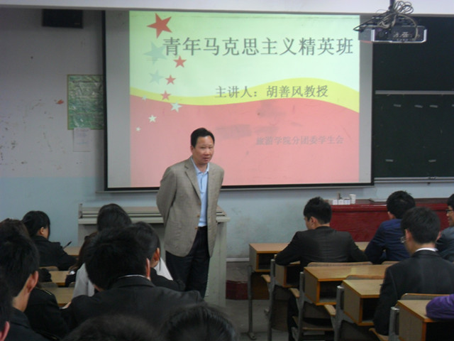 课上,胡善风首先从自身多年的从业经验及与人交际、对外访学的经历出发对学生干部们提出了诚实守信、礼貌礼节、学会感恩、掌握专业知识和能力四项素质在成才过程的重要性。同时还以“钢筋”、“中流砥柱”这类的生动比喻来强调学生干部的重要作用和意义。胡善风深入阐述了新时期培养青年马克思主义者的核心要求,并高度评价了我校共青团工作和旅游学院青年马克思主义培养工程的新探索,并对学院的青年培养和共青团工作寄予厚望。他表示,青年学生是祖国的未来,一定要做有本事的人,要学有所长,学有所成,学有所用;更要做有担当的人,把个人、社会、国家、责任结合起来,将所学知识传递到身边的同学,使更多同学加入到青年马克思主义者工程的培养中。最后,他殷切希望大家“今日做英才,明日做栋梁”。