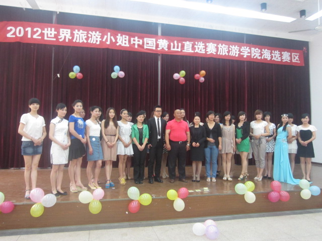5月30上午十点,2012世界旅游小姐中国黄山直选赛在旅游学院进行海选。世界旅游小姐中国区副主任迟春光、黄山市醉温泉度假城企划总监汪甜、黄山市醉温泉度假城企划经理王俊、旅游学院分团委书记邱慧及郭倩倩老师应邀担任此次评委。最终,旅游学院26位选手成功晋级复赛。此外,吴婷荣获院级一等奖,张凯丽、张玉立获二等奖,周旭、白雨晴、於妍等八名选手获三等奖。