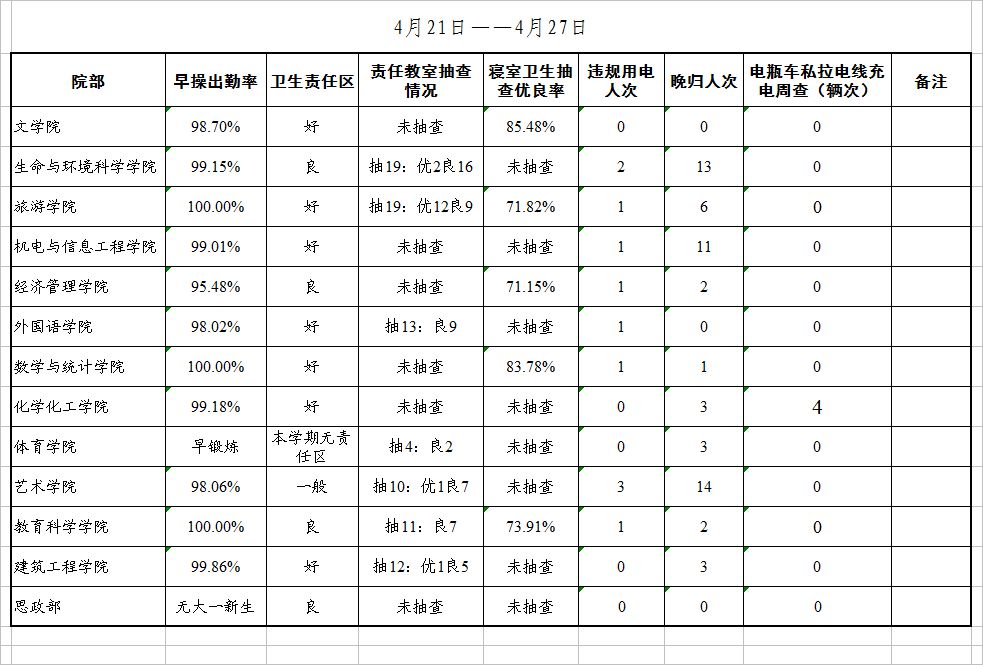 | 旅游学院 | 19 | 12 | 6 | 0 | 1 | 未打扫 |