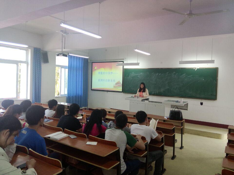 活动一开始刘娟同学简单介绍了一下关于博鳌亚洲论坛,博鳌亚洲论坛2015年年会于3月26日至29日在海南博鳌举行。3月28日,中国国家主席习近平出席开幕式并发表主旨演讲,强调亚洲要迈向命运共同体、开创亚洲新未来。其次亚洲基础设施投资银行筹建工作迈出实质性步伐等这些早期收获向我们展现了“一带一路”的广阔前景。接着刘娟同学让大家交流此次活动的心得体会,每个人都积极参与,踊跃发言。