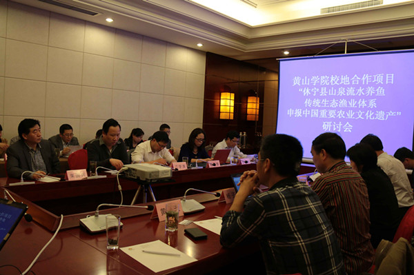 4月1日,副校长胡善风出席黄山学院“休宁县山泉流水养鱼传统生态渔业体系申报中国重要农业文化遗产”项目研讨会并讲话,中国水产科学研究院渔业发展战略研究中心秘书长杨子江研究员、休宁县人民政府副县长刘桃红、黄山市农委副主任徐保江、池州学院数学与计算机科学系主任黄海生教授、旅游学院书记毕民智、院长朱国兴及项目团队专家出席会议。