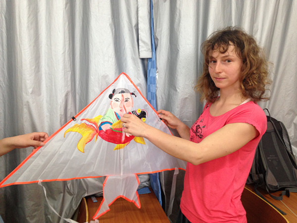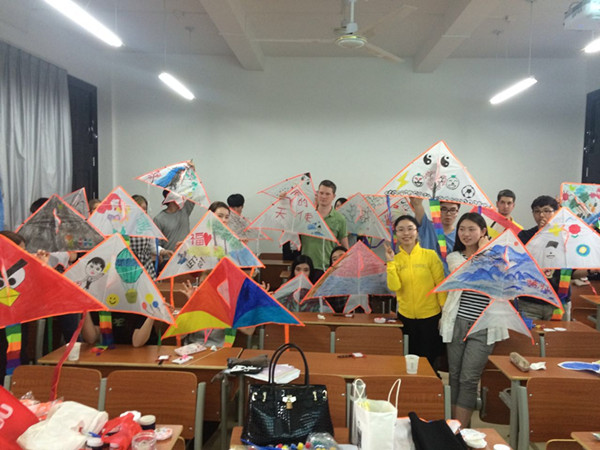 课程伊始,郑珺老师为大家介绍风筝的由来、典故和风筝的分类,其中“墨子为木鹞”,“李邺作纸鸢”等妙趣横生的历史故事让教室里笑声一片,色彩缤纷、形状各异的风筝激起了留学生们的阵阵惊叹,生动活泼的课堂气氛加强了留学生对中国传统文化学习的兴趣。接下来,14中韩的同学给留学生展示了自己制作的“锦绣山河”山水画风筝以及中国书法风筝,留学生们跃跃欲试。在14中韩同学的帮助下,每个留学生都积极参与到其中,设计绘制自己心中美丽的风筝。既有可爱的卡通风筝,也有美丽的风景画风筝,还有写了汉字的风筝,其中来自捷克的灵犀绘制了“富贵福娃抱鲤鱼”风筝,来自韩国的同学绘制了带有两国国旗,象征中韩友谊的风筝。在风筝制作的过程中,中外同学积极交流互动,教室里热情洋溢,热闹非凡。