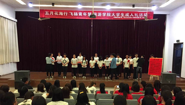 5月4日晚,旅游学院团总支携手13级、14级旅游管理专业团支部在北区报告厅开展"五月花海行·飞扬青年梦"成人礼活动,辅导员杨潇老师、班级同学近300人到场观礼。