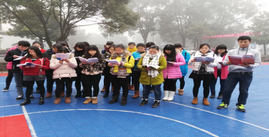 数九寒冬,冷风习习。15旅管(1)班的同学应班委号召,自觉地在校篮球场附近晨读。