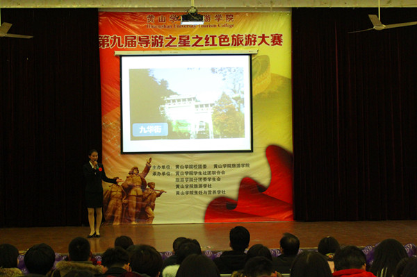 当晚决赛中,各选手通过现场讲解和才艺展示两个环节带领观众领略各景区不同的风景以及历史文化,表现出导游员应具备的的专业素养。其中15旅管(对口)班周鵷以其流畅的语言,生动的讲解带领大家走进九华山,让人身临其境,获得评委和观众的一致好评。才艺表演环节,选手们各展风采,舞蹈、相声、歌曲倾情上演。其中,朗诵《遗梦到徽州》紧扣主题,展现出古徽州的红色抗战历史;礼仪操结合专业特色,体现专业素养。活动期间,穿插着“红歌竞猜”互动环节,将现场气氛推向高潮。最后,由方敦礼、徐艳老师分别对中、英文选手的表现作出精彩点评。