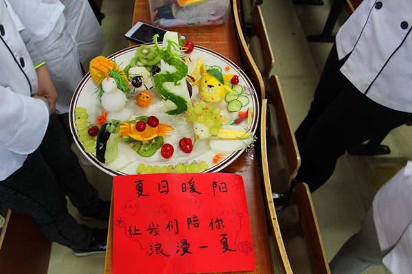 此次比赛共有69组近300人报名参加,分为专业和非专业组。比赛要求各组在规定时间内,利用自带的水果蔬菜自主设计水果拼盘并对作品进行讲解。比赛中,参赛选手利用主办方提供的刀具、餐盘,对水果进行削皮、切片、雕刻、摆盘等一系列处理,展现出精妙的创意构思和精湛的技艺水平,充分发挥出水果的艺术价值。随后,评委们细心聆听选手作品讲解,并对刀工及摆盘技巧提出建议和指导。