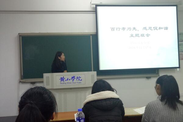 11月17日晚七点,15酒管班在南区六教6308教室召开“百行孝为先,感恩促和谐”主题班会。班会由辅导员张瑞老师主持,全体同学参与。