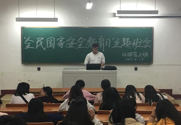 为深入宣传贯彻总体国家安全观,营造安全、和谐的校园氛围,16旅管(2)班全体同学于4月17日晚20:00在1102教室召开了“全民国家安全教育日“主题班会,会议由辅导员助理张楷同学主持。