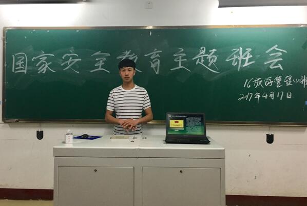 今年4月15日是第二个全民国家教育日,为进一步提升我班学生国家安全意识,16旅管(1)班于4月17日晚19:00,在北教区召开了全民国家安全教育主题班会,此次活动由班长王浩同学主持,16旅管一班全体同学参会。
