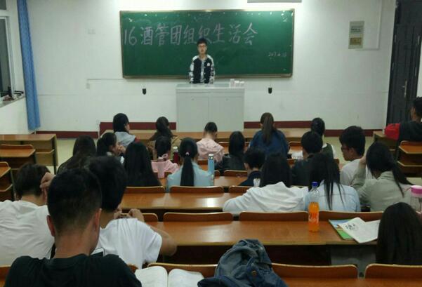 为学习贯彻习近平总书记在同各界优秀青年代表座谈时的重要讲话精神, 深刻理解习近平总书记对广大青年提出的坚定理想信念、练就过硬本领、勇于创新创造、矢志艰苦奋斗、锤炼高尚品格五个方面的重要要求。16酒管班于4月23日晚7点在1401教室召开团组织生活会,会议由团支书王天宝主持。
