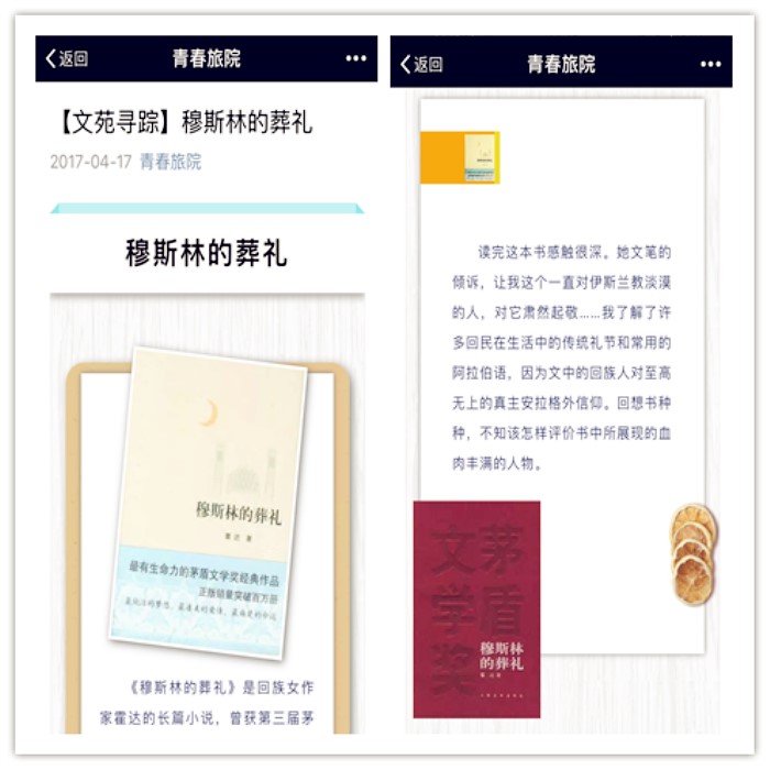 春暖花开季,正是读书时。该院开展文苑寻踪活动,通过每周在微信平台介绍一本好书,推荐给同学们阅读,以充实学生课余生活,提升文学素养。其中一篇推荐书目《穆斯林的葬礼》就是希望同学们认识到,人生之路即便长满荆棘,也应学会潇洒度过,珍爱大学时光,绝不虚度。