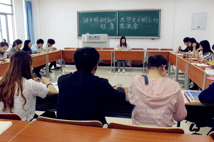 为响应学校“转作风、强教风、优学风、树新风”建设年活动的号召,近日,旅游学院团总支学生会在南区6312教室召开“讲文明·树新风”大学生文明公约征集交流会。院青年学生代表参加此次交流会,会议由该院学生会主席施雯君主持。