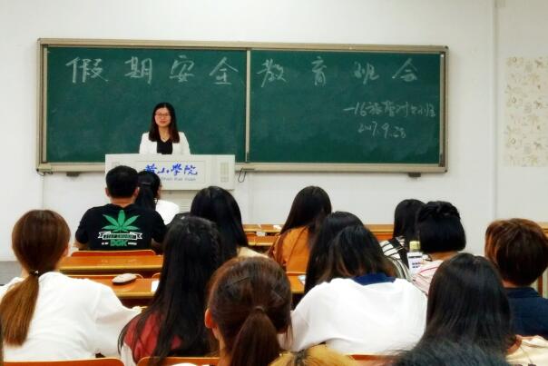 首先,辅导员凌淑瑜进一步明确了假期的请假制度,规范请假程序。随后,通知同学们国庆假期后学校的作息时间调整。其次,要求各位同学在假期开始前做好离校登记台账工作。再次,通过身边的事例提醒同学们在人身安全、财产安全、食品安全等方面提高防范意识。最后,辅导员凌淑瑜再次强调“校园贷”问题,要求同学们树立正确的消费观,远离“校园贷”。