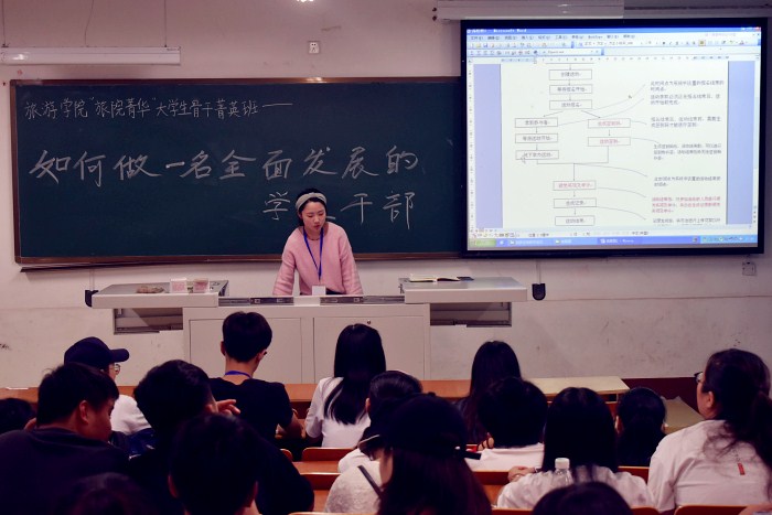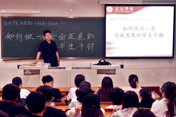 5月27日下午,旅游学院“旅院菁华”团学骨干菁英班在北区1203教室举办,此次培训主题为“如何做一个全面发展的学生干部”,该院团总支副书记项昱担任主讲人,院学生会大一成员,17级班级班长、团支书参加了此次培训,。