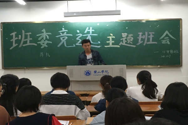 为迎接正式的大学生活,使班级相关活动有序、有效开展,增强班级集体凝聚力,营造良好学习氛围。18旅管(中韩)班于10月9日晚上7点在北区教学楼1208教室召开“班委竞选”主题班会。会议由辅导员凌淑瑜老师主持,全班同学积极参加此次班会。