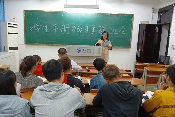 为维持正常的教学秩序,加强新生校纪校规教育,提高学生遵守校规校纪的意识,培育优良学风,18旅管(中韩)班于10月16日20:00在北区教学楼1208教室开展开《学生手册》专题学习活动。本次学习活动由辅导员凌淑瑜老师主持,全班同学积极参与。