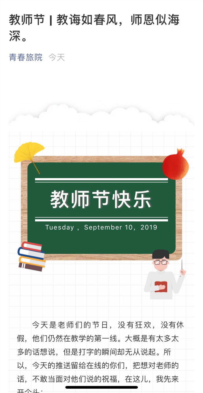 9月10日,该院微信公众号推送了精心制作的专题内容,通过“九月浓情,勿忘师恩”的主题表达了对老师们的祝福,院系同学们积极在评论区留言,表达出了自己对老师的心声,千言万语道不尽莘莘学子对老师的敬重与感恩。当天,各班级也积极开展了主题活动,为老师献上鲜花和卡片,表达对老师们的敬意和感恩。
