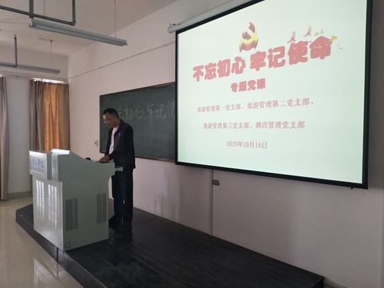 为响应习近平总书记“不忘初心,牢记使命”主题教育的号召,2019年10月16日下午,旅游管理第一、第二、第三党支部和酒店管理党支部联合开展了“不忘初心,牢记使命”专题党课活动。