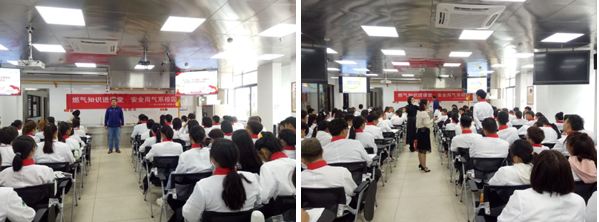 叶丽萍经理首先为大家讲述了关于如何安全使用天然气知识,通过图片、视频等方式并结合近年来在全国各地发生的大小火灾事例,向我们展示了社会生活中的火灾事故的起因。然后叶经理对如何预防火灾、如何检查天然气泄漏及天然气泄漏怎样处理等方面也一一作出了详细讲解。最后进入了互动提问环节,在座的同学积极踊跃回答各项关于安全使用燃气知识的问题,现场气氛十分活跃。