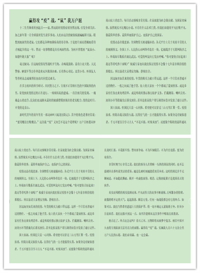 为贯彻落实习近平总书记重要指示精神,依靠人民群众打赢疫情防控阻击战,迎接“学雷锋”纪念日到来,旅游学院团总支组织发起文化战“疫”志愿者行动,开展以“抗疫防控”为主题的文化作品创作大赏活动,面向全院学生征集作品。