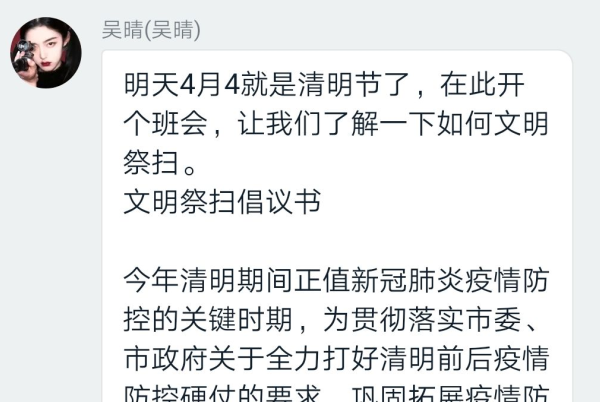 班会上,安全委员对全班同学提出了几条建议:提倡网络祭扫,提倡居家祭扫,提倡环保祭扫,提倡安全祭扫,提倡节俭祭祀。班会上还说明:疫情期间保护好自己家人的健康就是对逝者最好的告慰,清明祭拜重于心不拘于行,倡导文明祭扫既是疫情防控需要,也是时代所趋。希望广大市民朋友树立文明祭扫观念,倡导文明祭扫新风,用文明祭扫的实际行动,为防控胜利与创建文明城市贡献一份力量。
