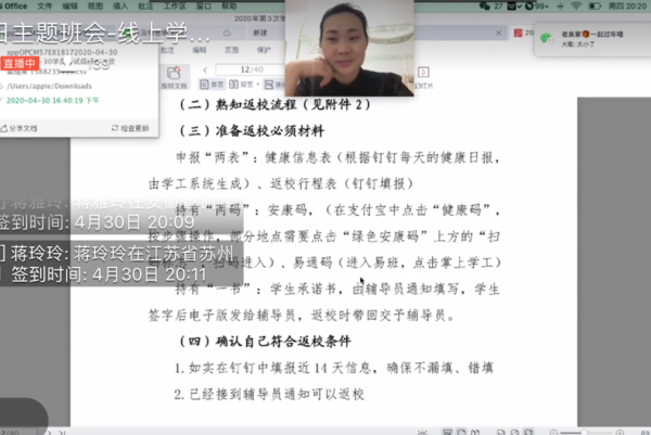 因受疫情影响导致我们延迟开学时间,现在有学校陆续开学,我们由辅导员吴宁宁召开“线上学习返校知识”主题班会。