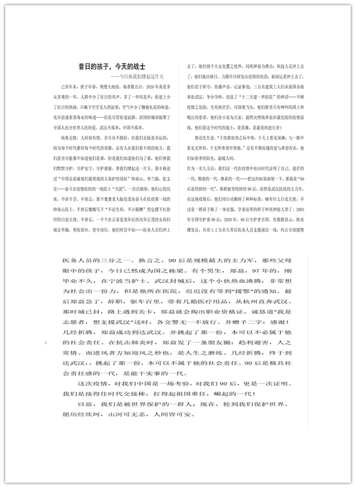 此次大赛历时近一个月,参赛选手们用青春的笔触,紧扣主题,围绕抗击疫情期间的实录、进展、见闻、事迹等,生动书写医护人员、科研人员、物业人员、服务保障人员等的感人故事,记录着不平凡的2020年开年阶段,带给我们的思考感悟。字里行间展示着同学们积极向上、勤奋学习的责任感和使命感。