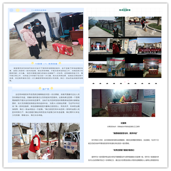 展示推文中,介绍了获评的优秀团员、团支部,在疫情期间以集体或个人的名义,在力所能及的范围内或通过各种渠道和方式捐款捐物,或为防疫和抗疫工作贡献绵薄之力,通过各种方式发挥团支部战斗堡垒作用,广大团员青年在抗击疫情中当好“战斗员”、“宣传员”,为抗击疫情取得最终胜利贡献青春力量。