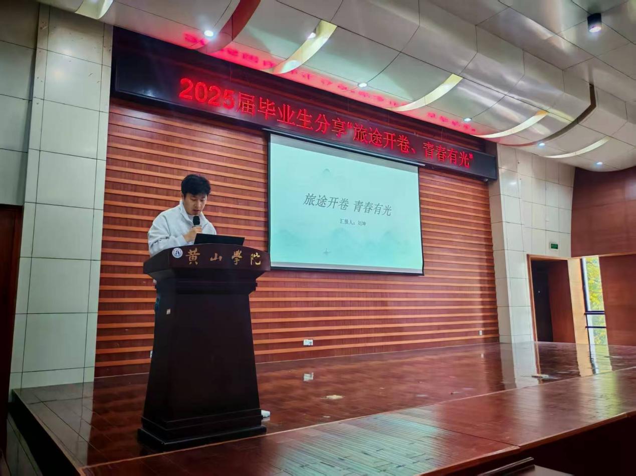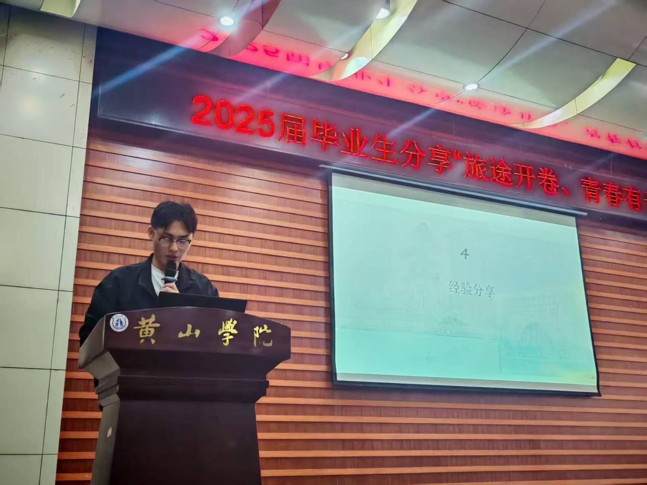 分享会上,主讲人向母校及指导老师表达了诚挚感谢。他结合大赛精彩瞬间与自身参赛经历,从“技能打磨”“知识储备”“心理素质”三个维度展开经验分享,回顾了备赛期间反复打磨景点讲解稿、创新设计导游词的过程,以及竞赛中的临场应变技巧,鼓励同学们勇于尝试、保持良好心态、积极参与实践,将课堂所学切实转化为服务游客的实际能力。现场,他展示大赛中的精彩讲解片段,其生动的语言、真挚的情感与大方的仪态赢得台下阵阵掌声。