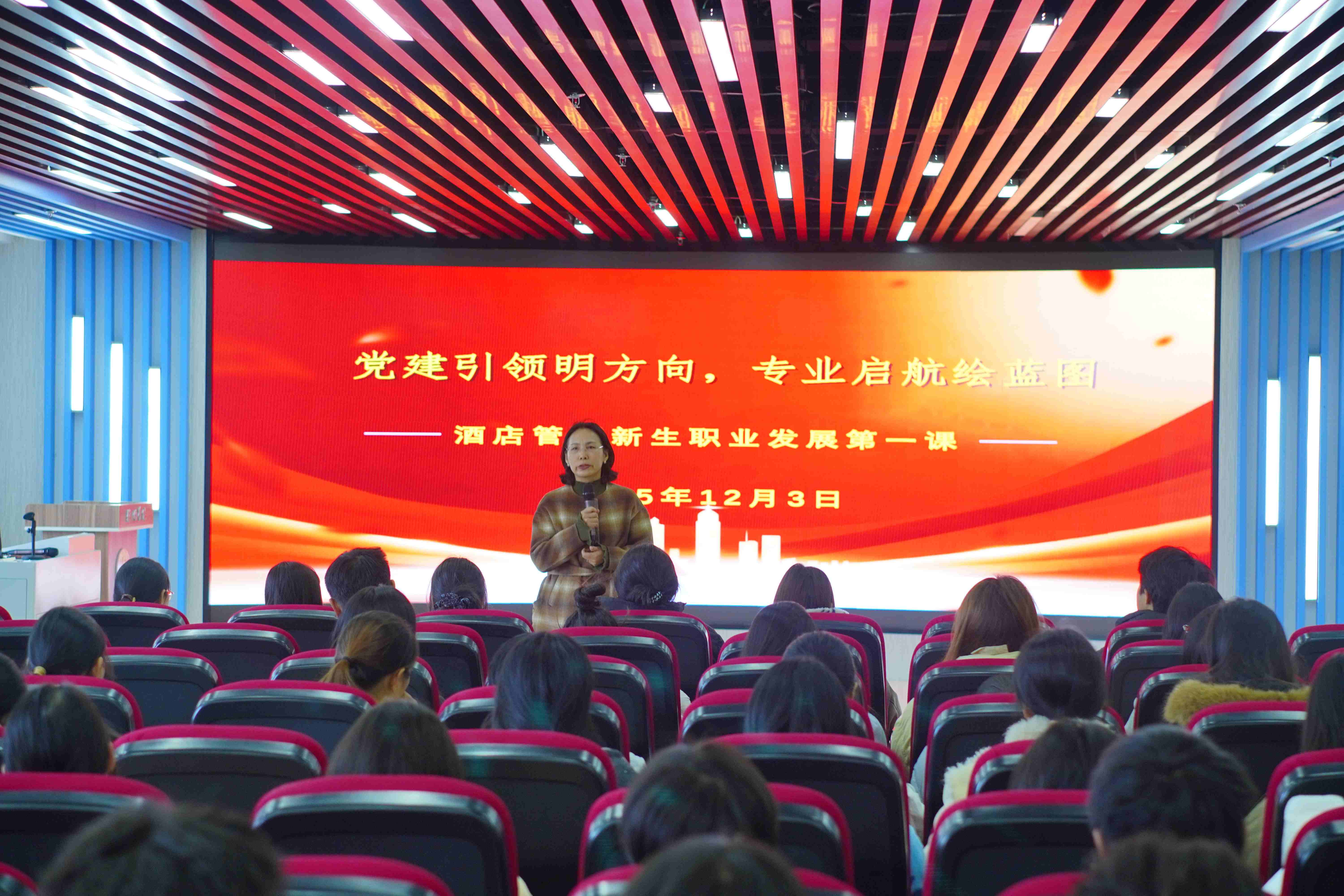 为推动党建工作与专业建设深度融合,创新党建育人形式,将立德树人根本任务落到实处,近日,酒店管理教师党支部组织开展“党建引领明方向,专业启航绘蓝图”——2025级酒店管理专业新生职业发展第一课讲座活动。本次活动特邀池州营销全案策划有限公司营销总监王凯主讲,给25级新生带来一场内容扎实、启迪思维的职业发展指导。