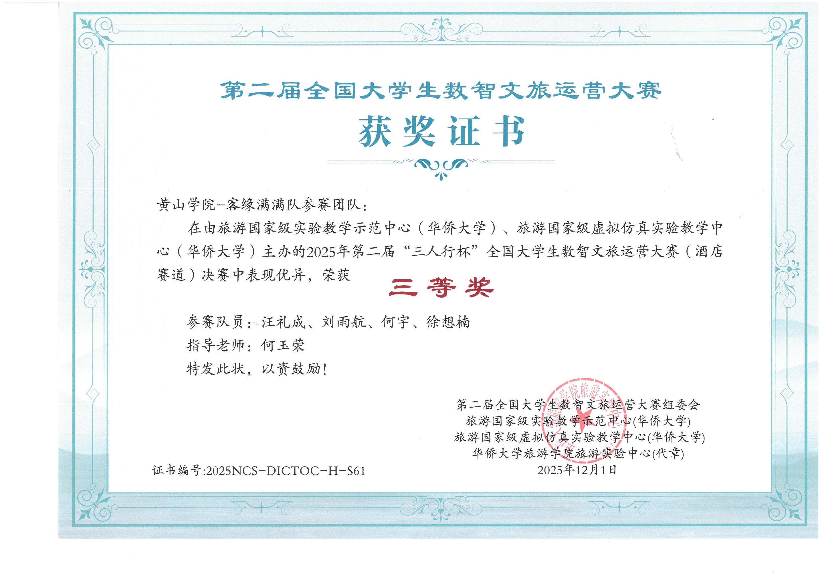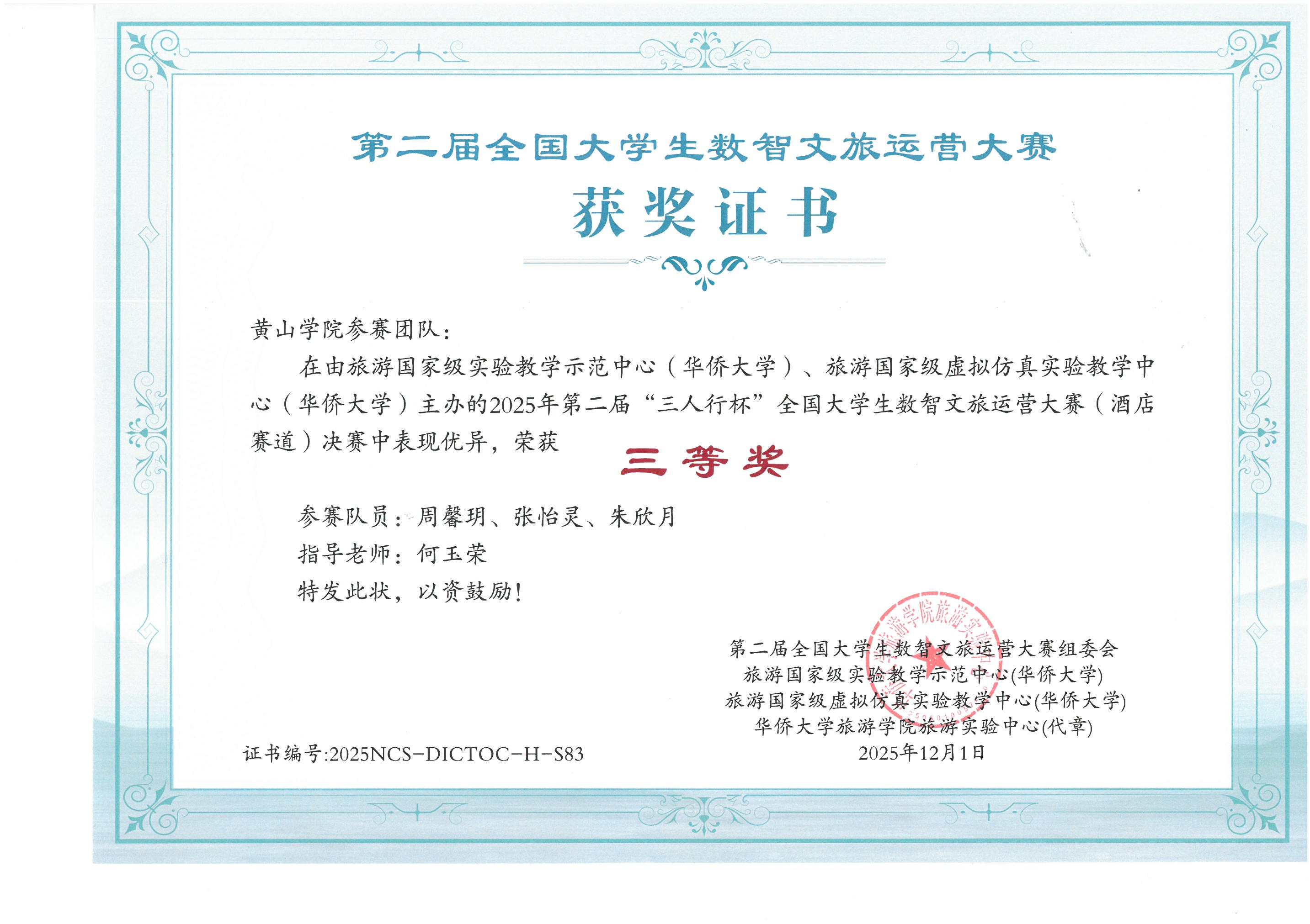 在为期两个多月的赛程中,经过初赛、复赛和决赛的激烈角逐,黄山学院旅游学院何玉荣老师指导的二支代表队凭借扎实的数智文旅运营实践、良好的数智运营策略与稳定的临场发挥,荣获大赛三等奖。