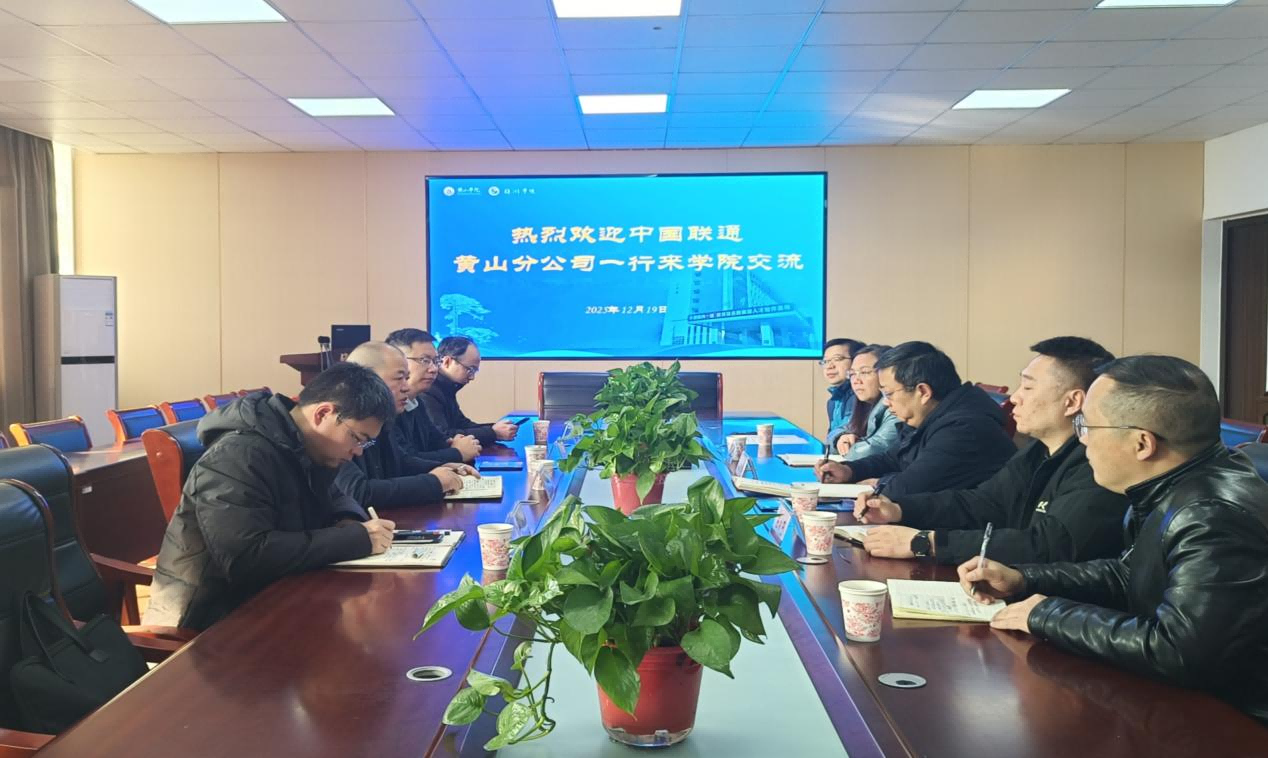 12月19日上午,中国联合网络通信有限公司黄山分公司总经理刘诗丰一行到访旅游学院,就校企合作相关事宜开展交流座谈。旅游学院院长姚李忠,副书记王式玉,副院长张俊香,以及产教融合中心主任、旅游管理教研室主任和相关教师代表共同参加座谈。