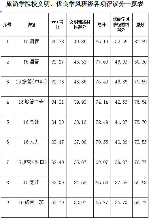 黄山学院旅游学院2016-2017学年文明班级、优良学风班级评审工作,经班级申请,申报材料评议,党政联席会讨论,拟推荐:15酒管、16酒管、16旅管(中韩)为校文明班级,15旅管二班、16烹饪、16人力、15旅管(对口)班为校优良学风班级;15烹饪、16旅管一班为旅游学院优秀班级。现将推荐班级名单(评议分一览表附后)公示如下,若有异议,请于2017年10月19日-10月22日到院学生工作办公室反映,电话号码为0559-2544806。