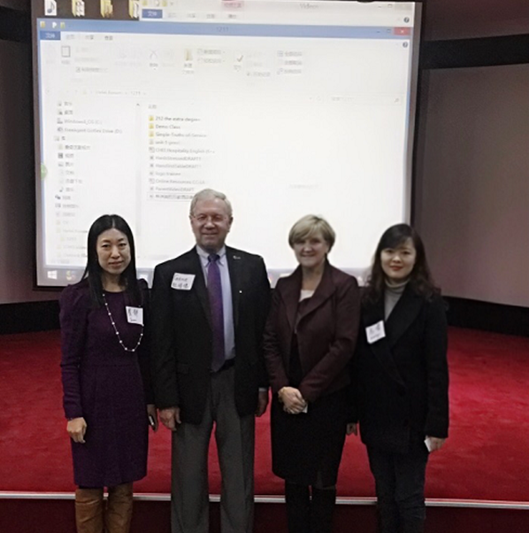 黄山学院副校长胡善风教授受邀在研讨会上就如何办好旅游管理及酒店管理专业以及如何通过校企合作提高教师队伍专业素养做了专题报告。项目团队教师在研讨会上通过“翻转课堂”示范课堂展示,万礼豪程酒店情景英语,将软性技巧植入课堂教学等课程的演讲,将更多的教学理念、先进的教学方法和资源工具和专业课老师进行了分享和演示。此类项目的参与也是旅游学院酒店管理专业“双师型教学团队”建设的系列活动之一。