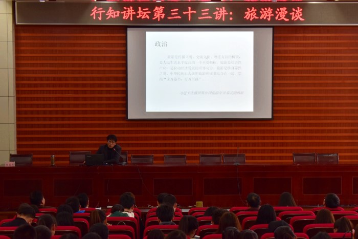 3月28日下午,我校“行知讲坛”第三十三讲在南区图书馆二楼报告厅举行。本次讲座的主题为“旅游漫谈”,旅游学院余向洋教授担任主讲。该院院长朱国兴主持报告会,旅游学院、科研处300名余名师生到场聆听讲座。