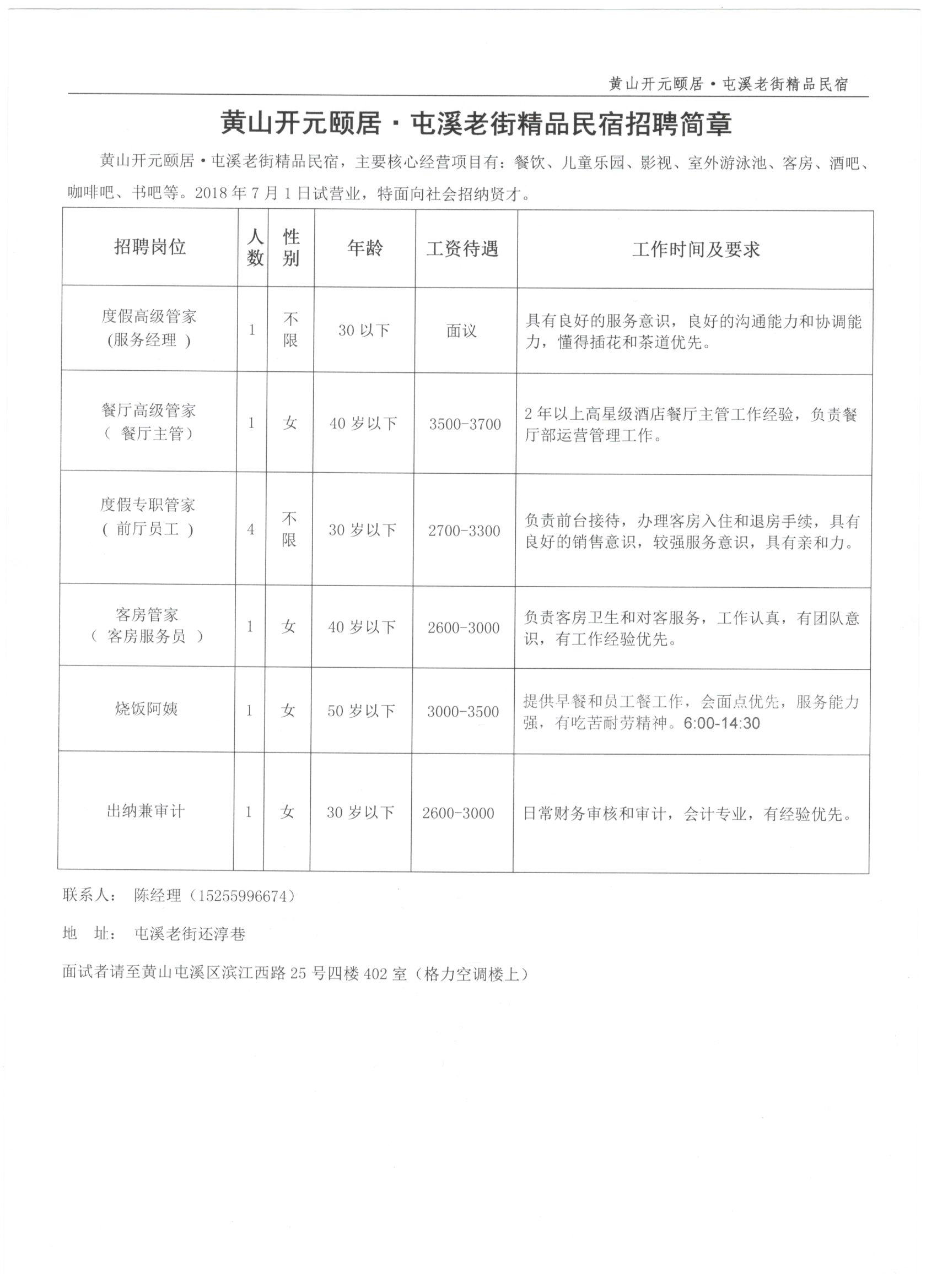 黄山开元颐局.屯溪老街精品民宿招聘简章