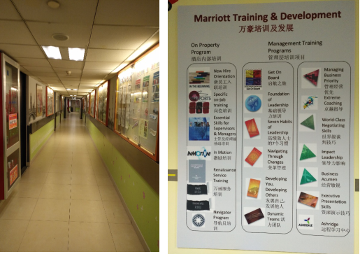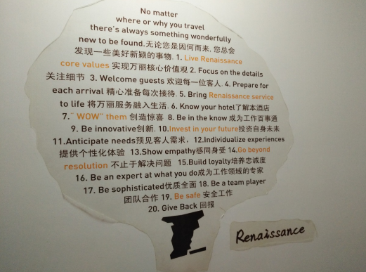 当然还有万豪集团,作为世界上最大酒店集团,那严密的管理系统,虽然短短的几天知之甚少,还是多多少少见识了。酒店对企业文化的灌输,从新员工培训,到酒店后区通道、楼梯上布满的墙贴,到人手一本万丽之道20条的背诵检查,也是挺有独到之处。